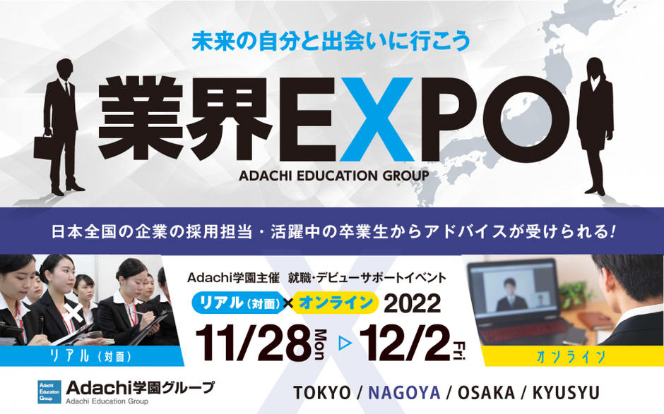 業界EXPO2022 専門学校名古屋デザイナー学院 業界就職・デビューに向けてのイベントを今年も開催! 全国姉妹校と連動して各地の企業様をお招きしてのビッグイベント! 各業界の企業採用担当者・活躍中の卒業生からアドバイスが受けられる! これはAdachi学園グループ入学者だけの特権です!! 全国から憧れの企業様が約1000社の参画予定。 リアルとオンラインを併用していき多くの企業様の話しが聞ける。 ここから業界へと進んでいきます。