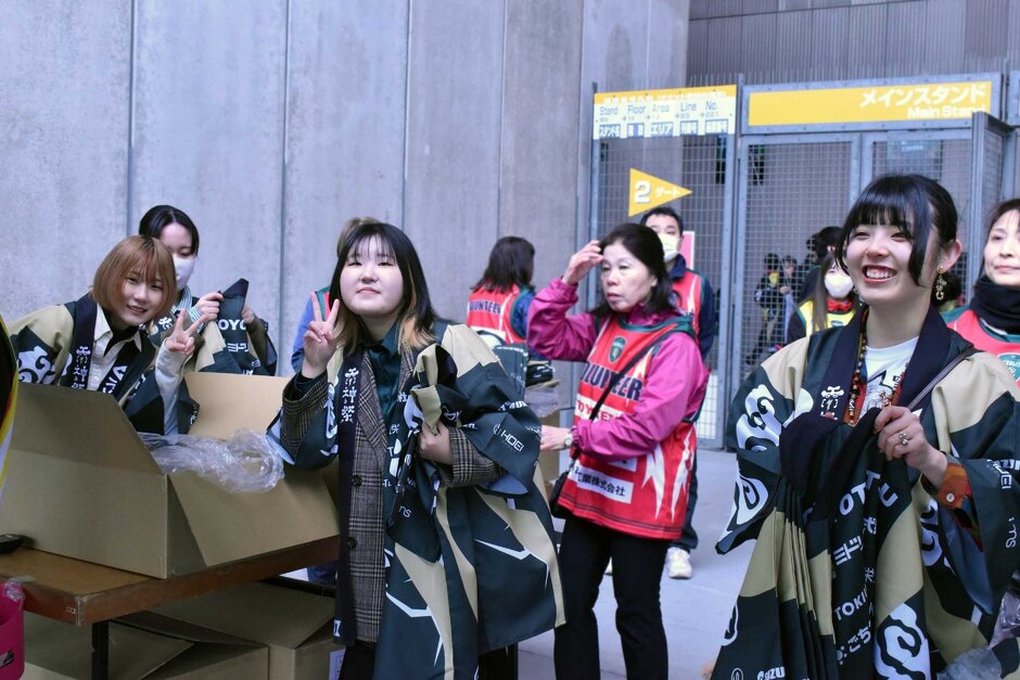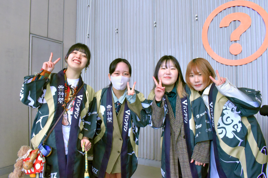 当日は法被デザイン制作に取り組んでいた学生4名が法被配りボランティアへ参加し、来場者の方に法被を一人一人手渡しでお届けしました!