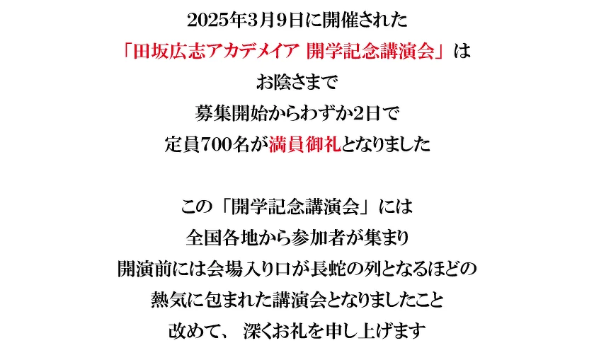 田坂広志アカデメイア 会員登録はこちら メールはこちらへ 「田坂広志アカデメイア」HPはこちら 田坂広志アカデメイア 公式HP 学校法人 21世紀アカデメイア公式HP メールはこちらへ 問い合わせはこちらのフォームから