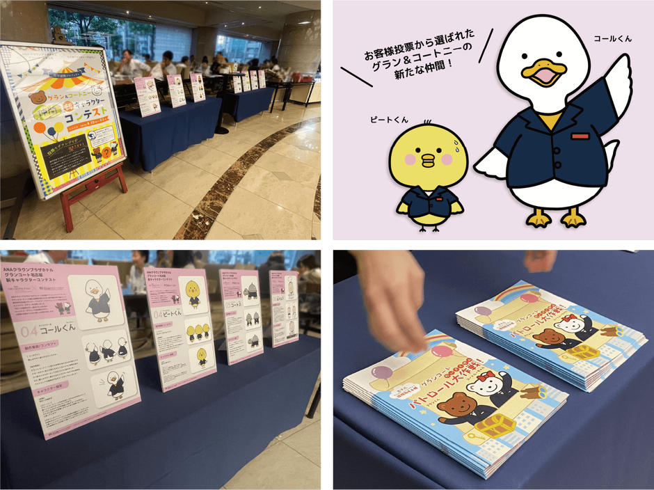 ホテルの舞台裏や館内をクイズしながら探検をする子供向けイベント「グランコートパトロール大作戦!」で使用する、ガイドブック「パトロール手帳」のデザインを担当しました。また、既存のキャラクターグラン&コートニーの新たな仲間になる、新キャラクターのデザイン採用コンテストを実施しました。